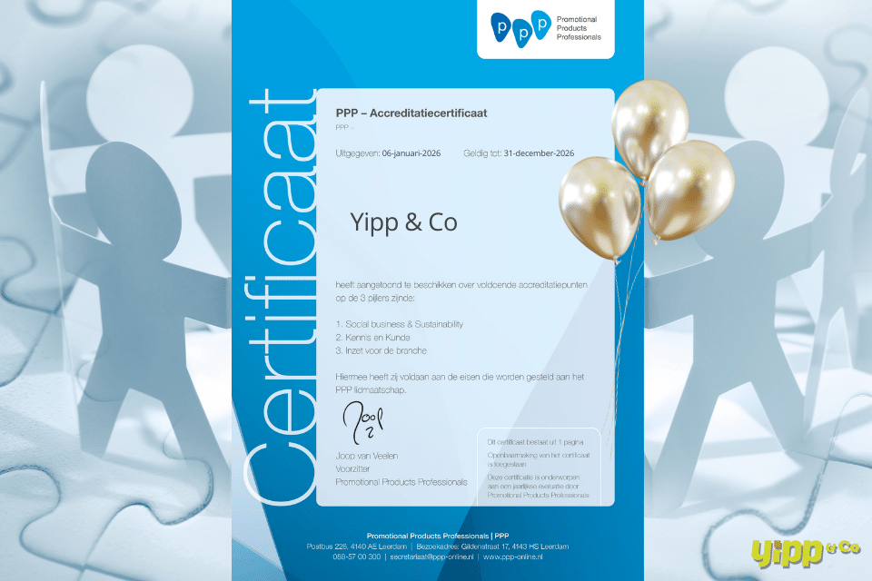 Yipp & Co biedt u met deze website een etalage aan innovatieve en originele relatiegeschenken en promotionele producten. U profiteert van het feit dat Yipp & Co linksaf slaat, waar anderen rechtsaf slaan. Oftewel, onze wegen kruisen als u zoekt naar een onderscheidend relatiegeschenk op maat, want bij ons staan maatwerk en persoonlijke benadering hoog in het vaandel.