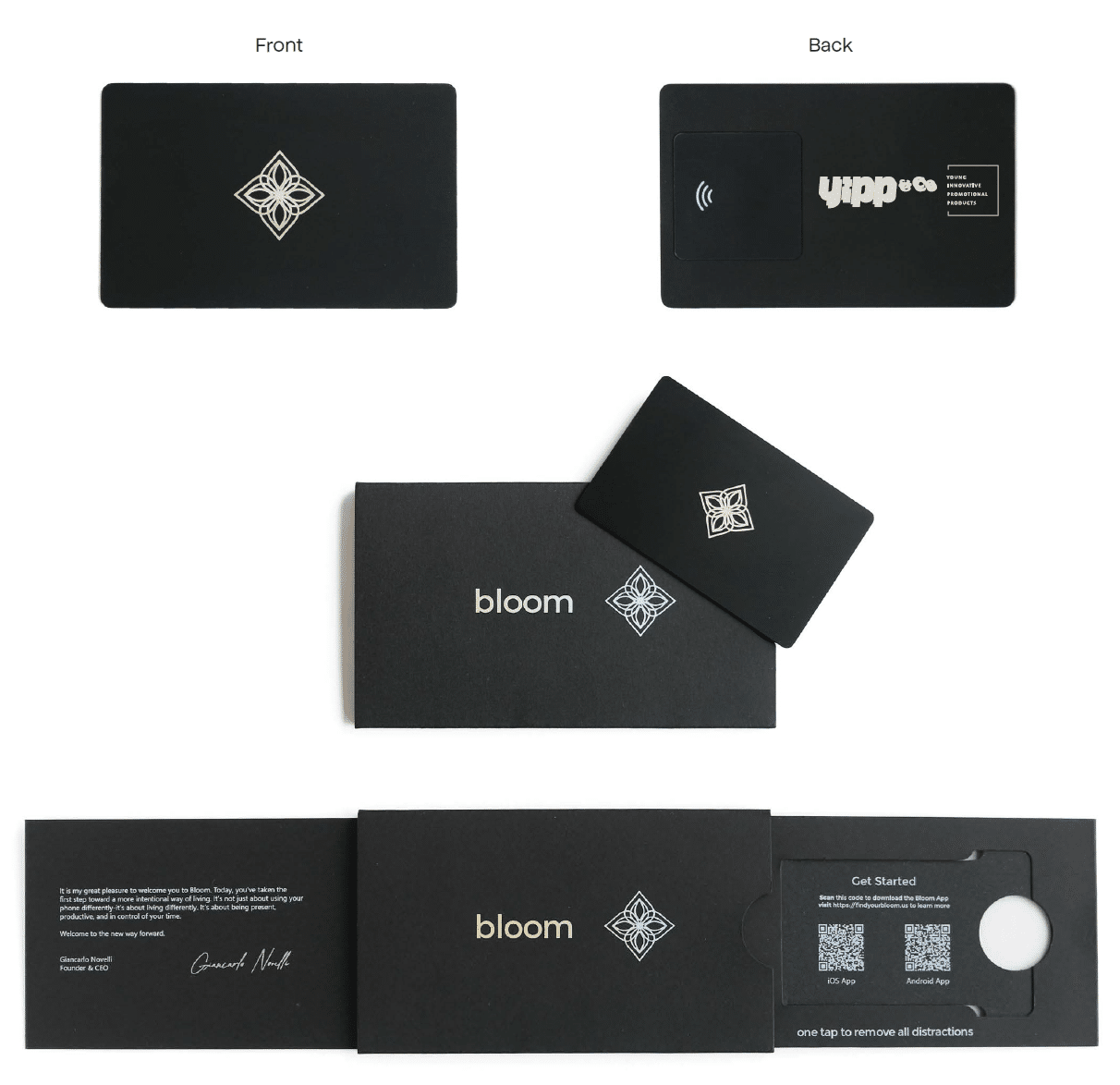 Bloom is een metalen kaart met NFC chip waarmee je afleidende en tijdrovende apps en websites kunt vergrendelen (blokkeren) op je smartphone of tablet. Zo kun je je schermtijd beter beheren, zowel op het werk als in je vrije tijd. Voeg je eigen logo toe en maak er een waardevol geschenk voor medewerkers of relaties van.