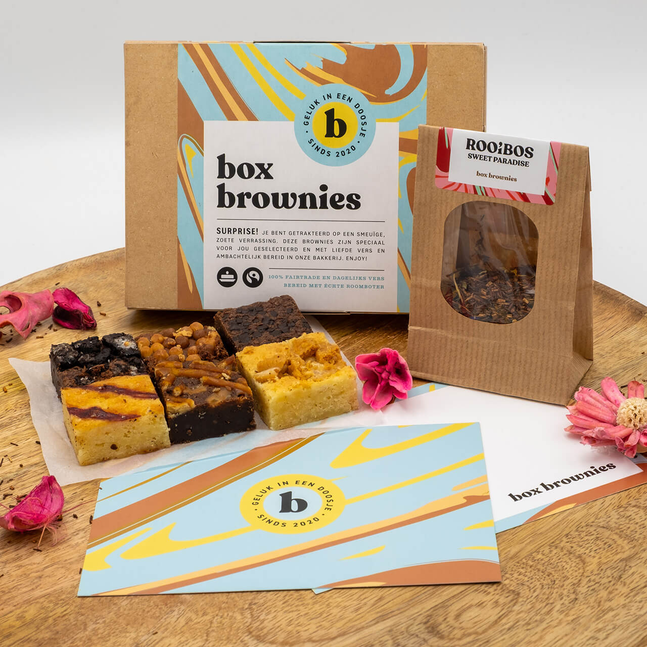 Bij deze brownies hoort natuurlijk een lekker warm drankje, daarom deze box met brownies én thee! Geniet van de 6 meest populaire brownies smaken, vergezeld met een heerlijk kopje zoete rooibos thee erbij!