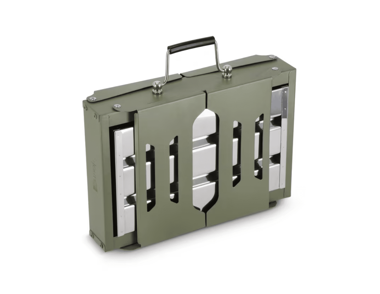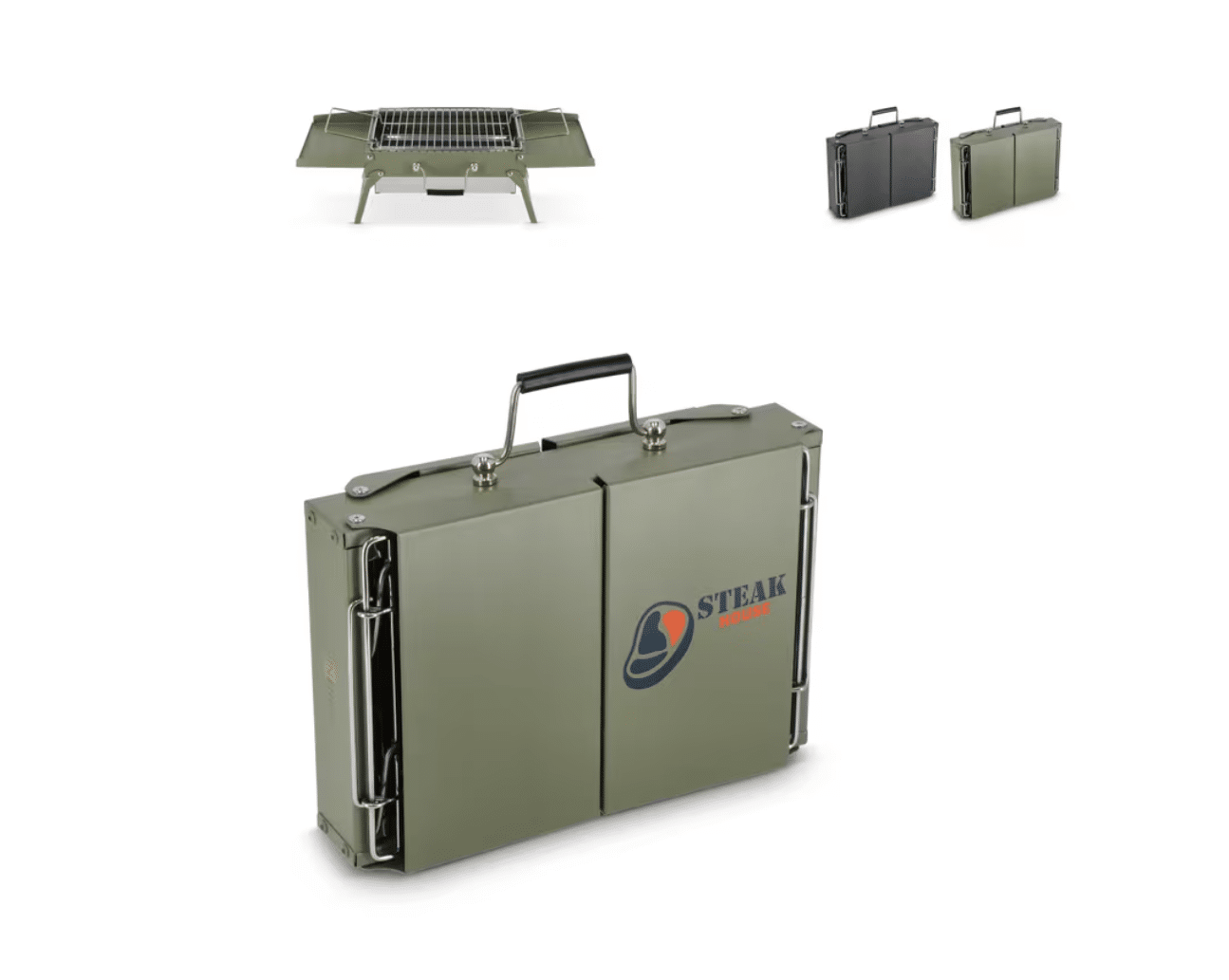 Dit is een handzame koffer barbecue, die je overal makkelijk mee naartoe neemt. Opvouwbaar, solide en voorzien van een handvat. Gemaakt van stevige materialen met een uitneembare kolenbak en inklapbaar grillrek. Ideaal voor 2 hamburgers, sate stokjes, grofgesneden groente of maiskolven. “Grill it hot, keep it simple and bold.