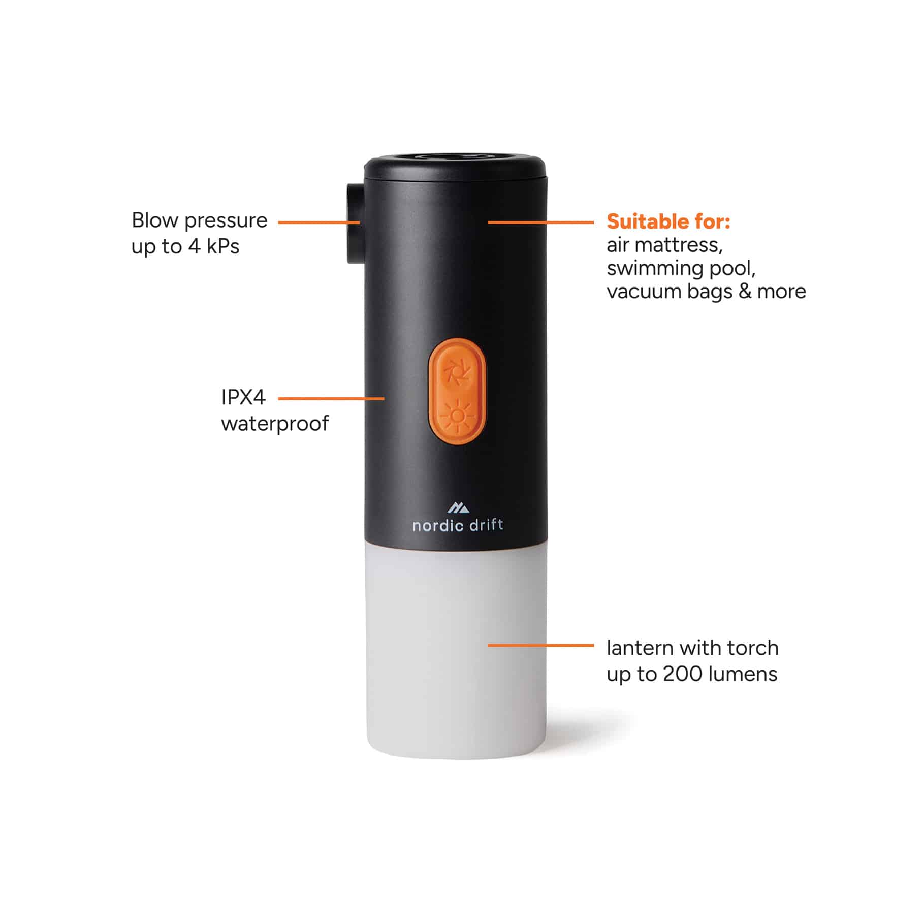 De Nordic Drift 2-in-1 Air Pump & Camping Light is een compact en draagbaar hulpmiddel voor outdoorgebruik. Dankzij het praktische ophangoog is hij geschikt voor gebruik in een tent of eenvoudig op te bergen in een zak of rugzak. De 2000mAh oplaadbare batterij wordt opgeladen via de meegeleverde USB-C-oplaadkabel. De PVC-vrije luchtpomp wordt geleverd met vier mondstukken en een 2-standenmotor voor snel opblazen en leeglopen, met een maximale luchtdruk van 4 kPa en een IPX4 waterbestendigheidsclassificatie. De geïntegreerde campinglamp van 200 lumen biedt vijf instelbare lichtstanden voor flexibele verlichting. Alle Nordic Drift-producten worden intensief getest op kwaliteit en elk item wordt geleverd met 5 jaar garantie op fabricagefouten. Dit is een handig product wat altijd van pas komt en ideaal inzetbaar is als zomergeschenk.