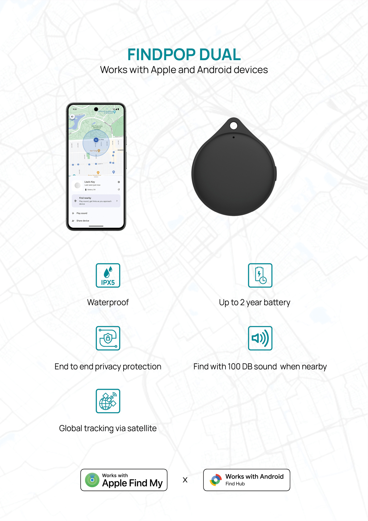 Raak je spullen nooit meer kwijt met Findpop, een premium tracker van RCS-gecertificeerd gerecycled ABS die naadloos samenwerkt met Apple Find My en Android Find Hub en daardoor geschikt is voor een brede groep gebruikers. Je ontvangt direct een melding wanneer je je eigendommen achterlaat en zelfs als ze volledig zoekraken, vind je ze wereldwijd eenvoudig terug via de ondersteunde netwerken. Ben je in de buurt, dan activeer je het extra luide 100 dB-geluid om de exacte locatie te bepalen. Dankzij de IPX5-waterdichtheid is Findpop beschermd tegen spatwater en regen, terwijl de vervangbare Panasonic CR2032-batterij tot 2 jaar meegaat. Gemaakt van RCS-gecertificeerd gerecycled ABS en verpakt in FSCĀ®-gecertificeerde verpakking.