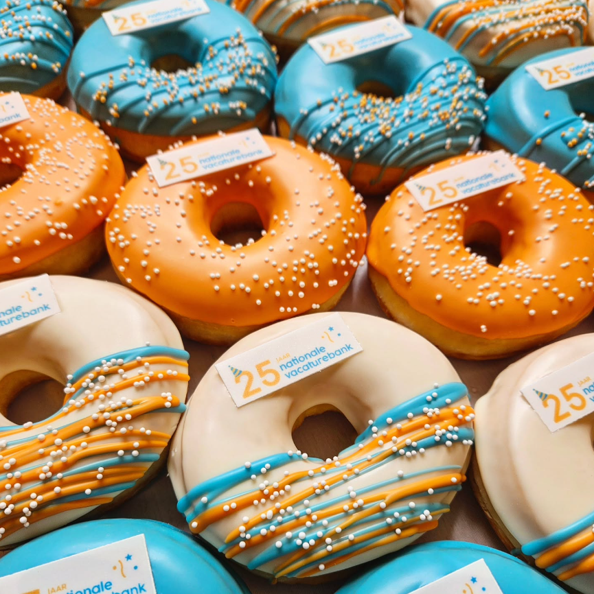 Met jouw logo, huisstijlkleuren of een persoonlijke boodschap maken we elke donut uniek en onvergetelijk. Verkrijgbaar in twee maten: mini donuts en gewone donuts.
