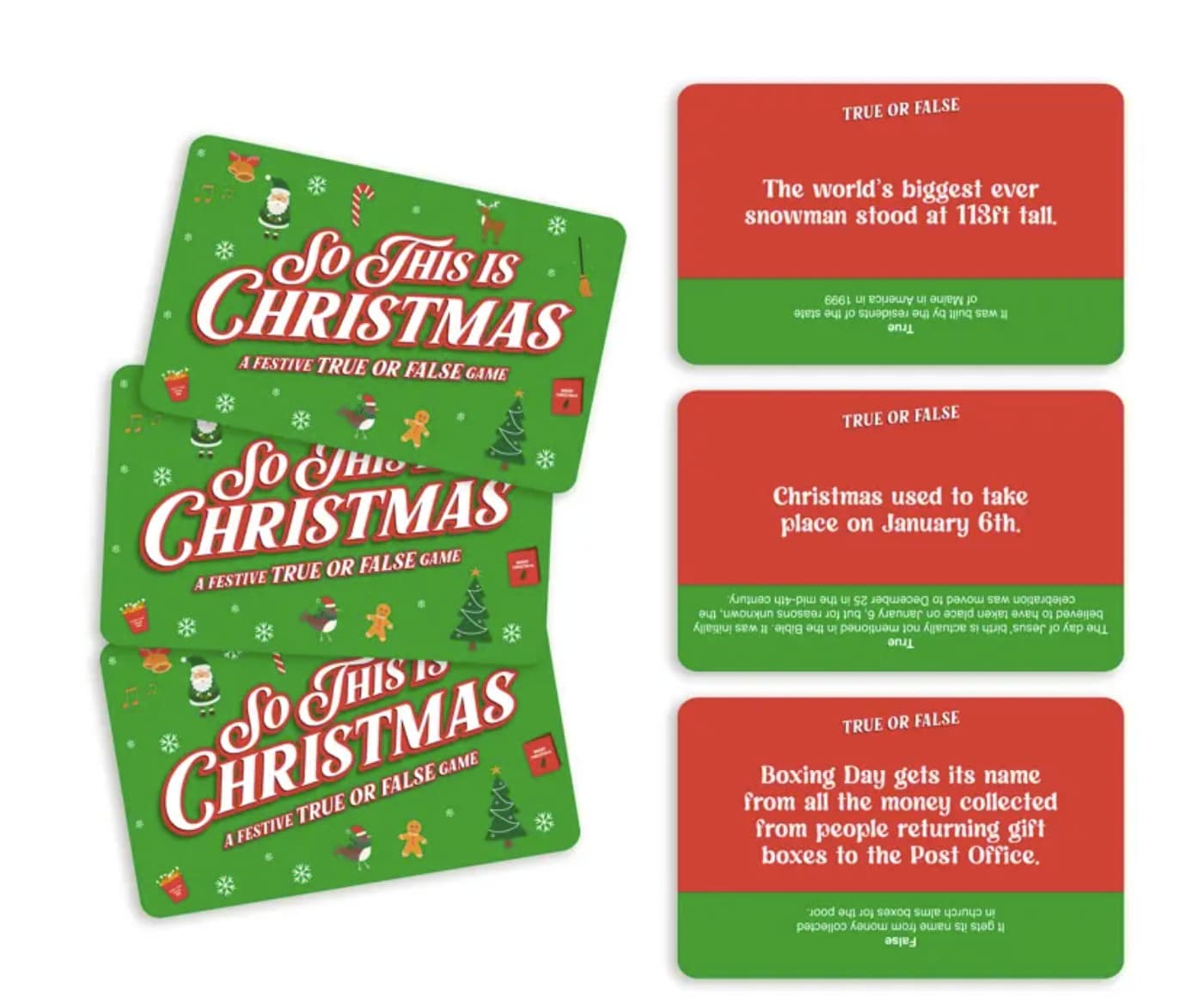 Denk jij alles te weten over kerst? Met het So This Is Christmas spel van Gift Republic test je jouw kennis met 100 feestelijke waar-of-niet-waar stellingen. Van bijzondere kerstradities tot bizarre feestmythen, moet je raden of het waar is of gewoon een sterk verhaal! Wie het goed raadt scoort een punt. Perfect voor een gezellige avond vol lachen en leren met vrienden en familie tijdens de kerstdagen.