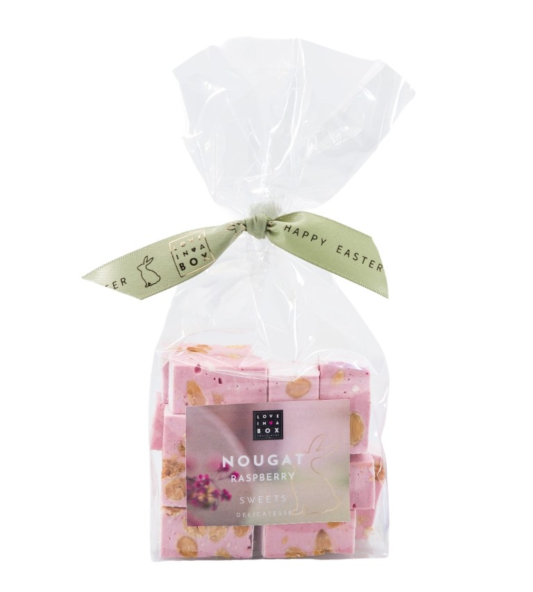 Paas nougat op basis van amandelen en framboos verpakt in een leuk paaszakje. Dit is een origineel Paasgeschenk 2026.