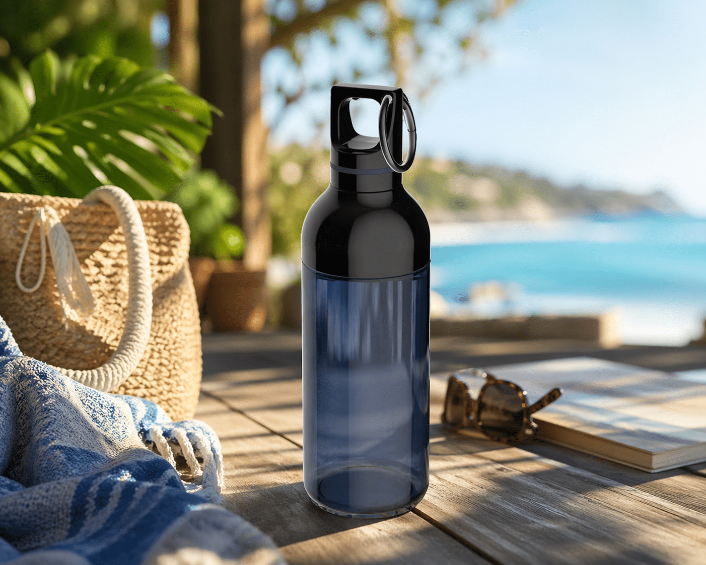 De fles is 100% lekvrij en voorzien van een stevige, gepatenteerde karabijnhaak die niet rammelt. Verkrijgbaar in diverse kleuren en met een siliconenring in 18 varianten. Daarnaast biedt hij uitgebreide personalisatiemogelijkheden met lasergravure, tampondruk en UV-bedrukking (180° of 360°).