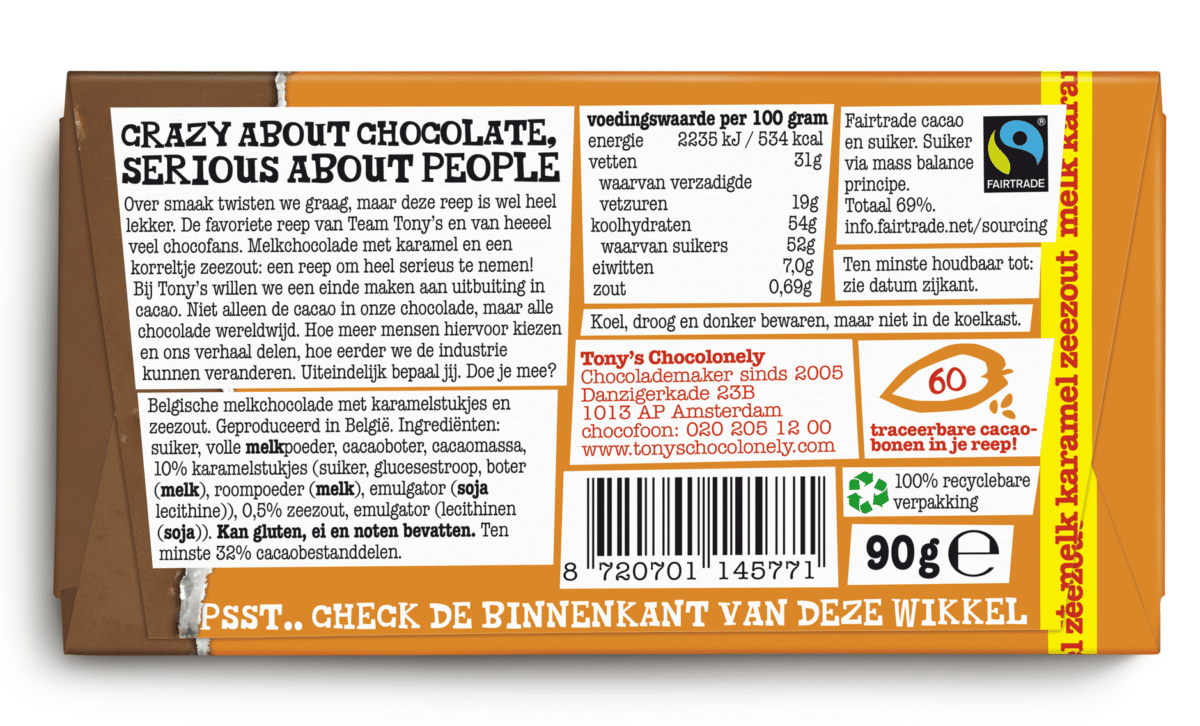 Dezelfde smaken als 180-grams Tony’s Chocolonely repen, maar nu in ‘n kleiner jasje. De nieuwe 90 grams repen. Keuze uit de volgende smaken: