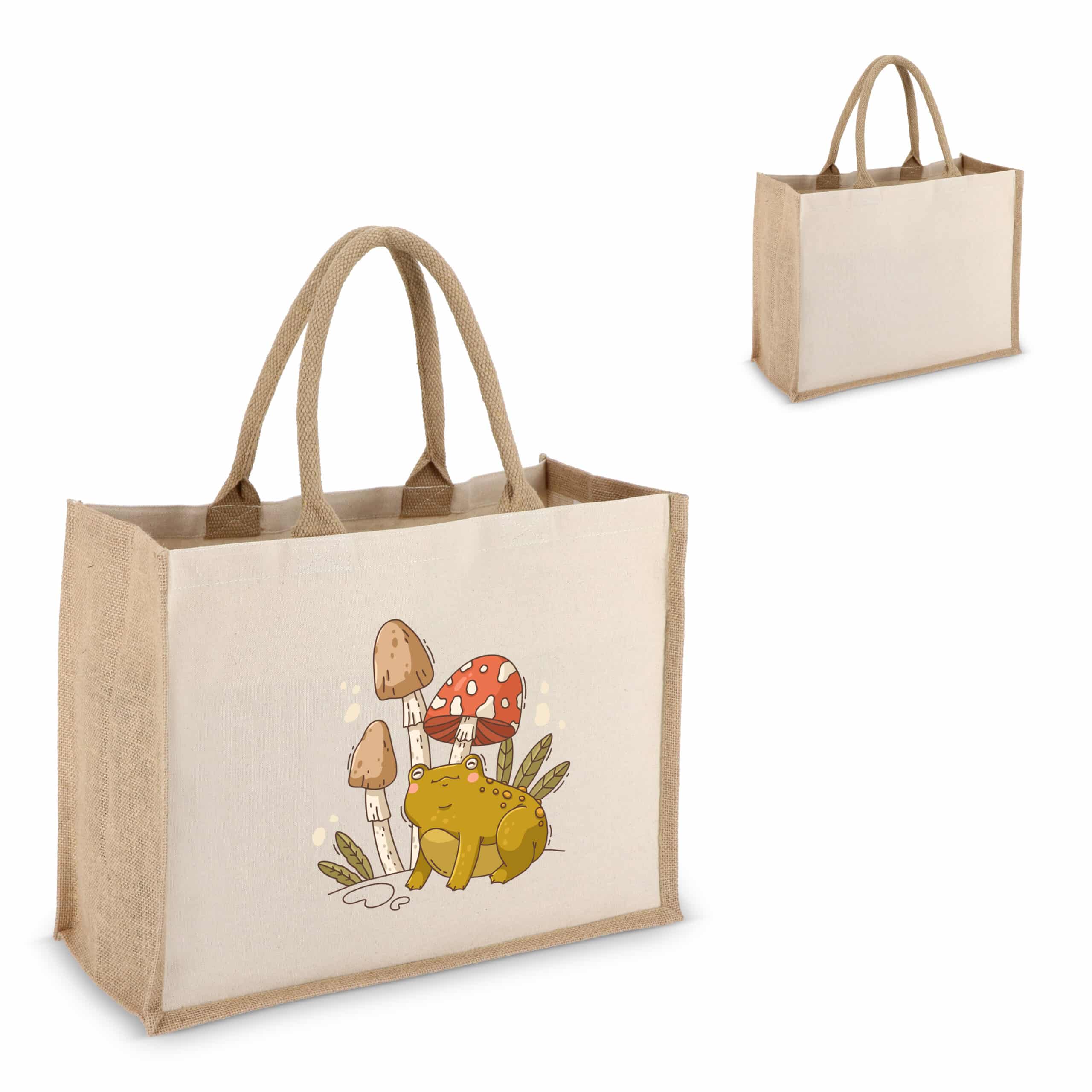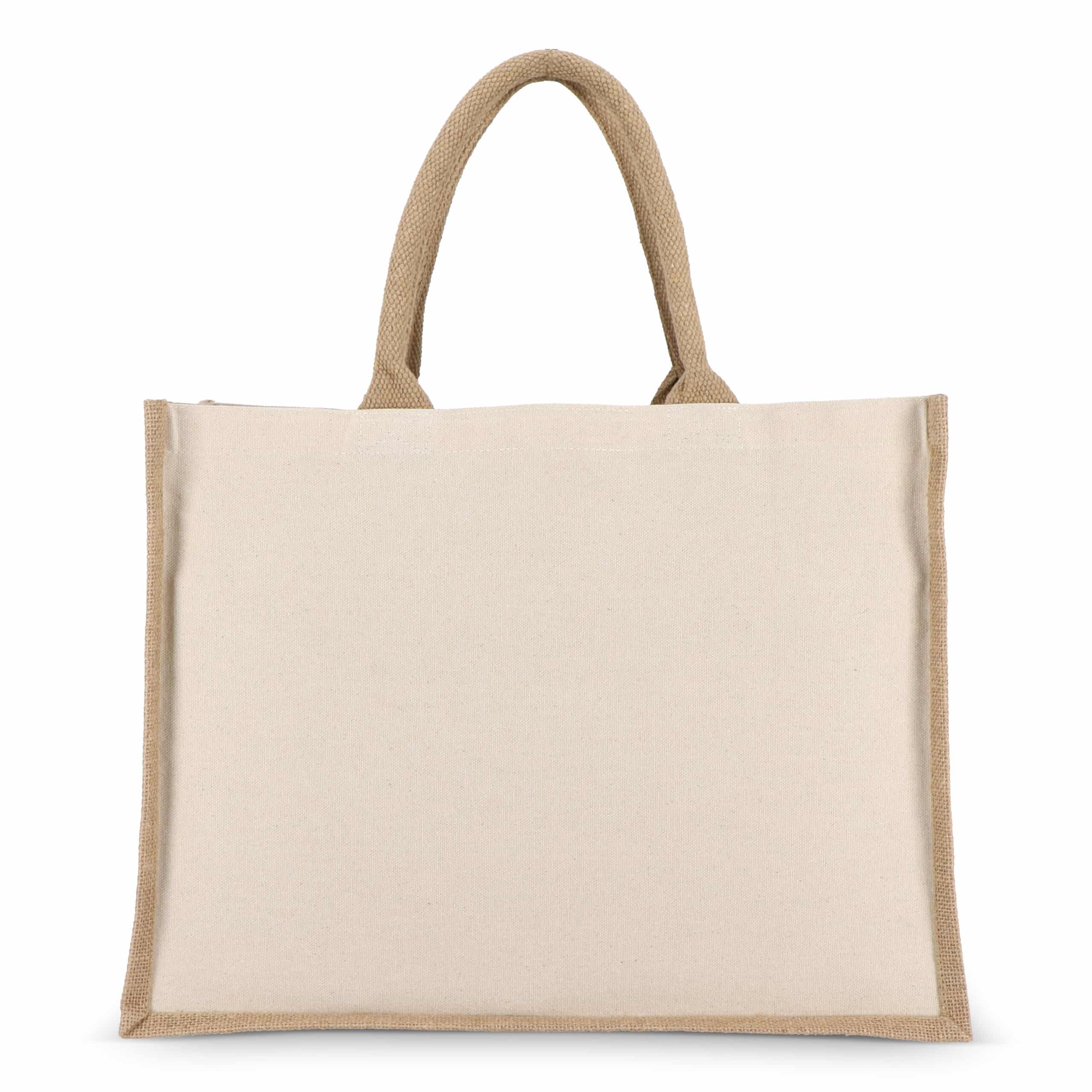 Deze jute-katoen totebag (320 g/m²) combineert stijl en duurzaamheid. De voor- en achterpanelen zijn gemaakt van stevig katoenen canvas, terwijl de zijkanten en bodem van jute zorgen voor een natuurlijke uitstraling. Afgewerkt met kleur-gecoördineerde katoenen handvatten. Oeko-Tex® gecertificeerd en ideaal voor retail, events of dagelijks gebruik.
