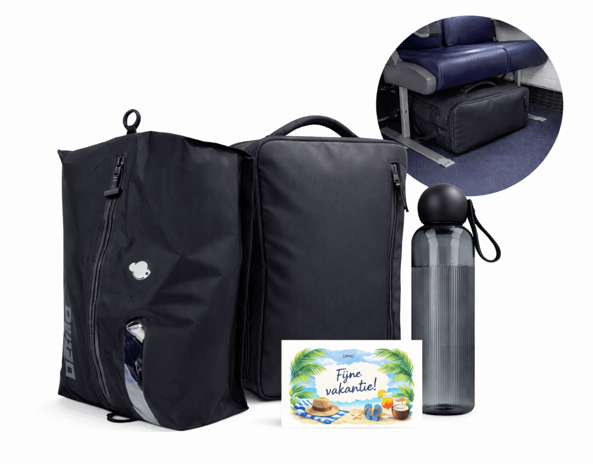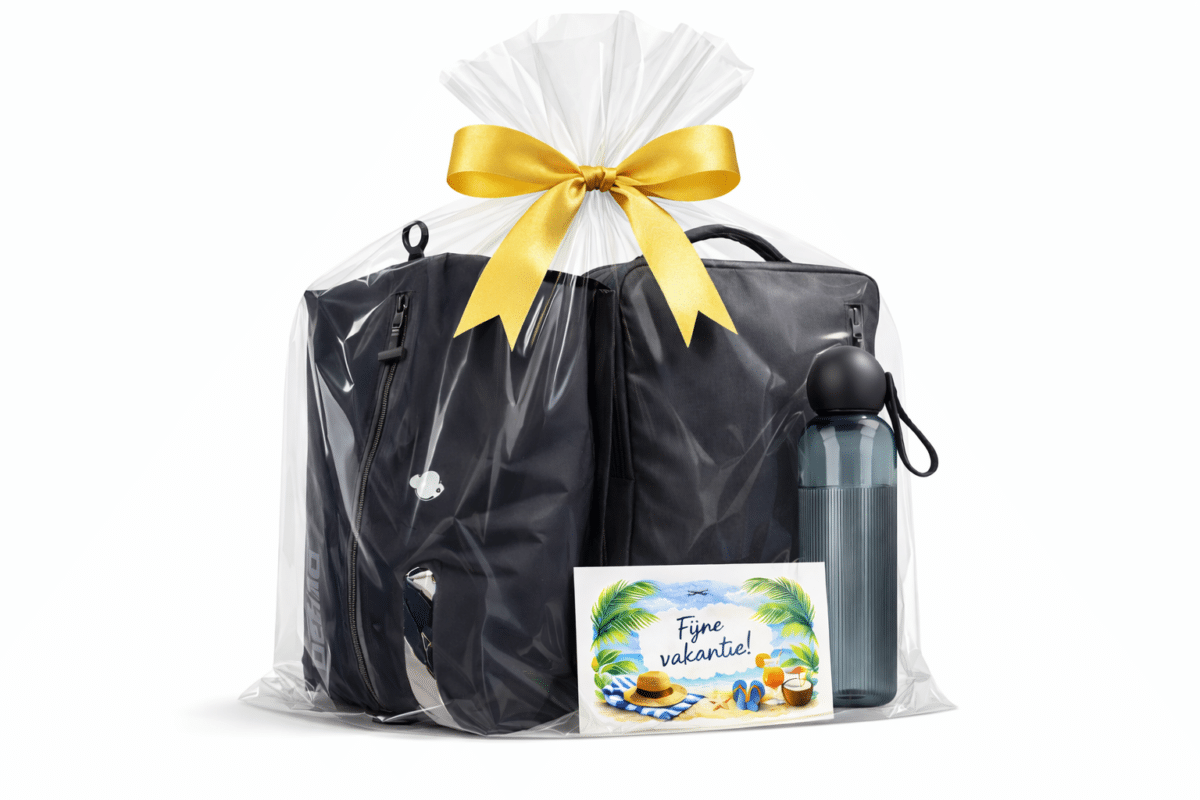 Ga vrolijk op reis met dit stijlvolle en praktische zomerpakket. De premium underseater van hoogwaardig PU-leer schuift moeiteloos onder elke vliegtuigstoel en is perfect als reis- én werktas. Dankzij het slimme, uitneembare vacuümcompartiment met handpomp bespaar je tot wel 60% ruimte, zodat je verrassend veel mee kunt nemen. De tas is voorzien van een 17 inch laptopvak, kabeldoorvoer en meerdere handige opbergvakken, waardoor al je essentials overzichtelijk en binnen handbereik blijven. Inclusief de Sagaform Ture waterfles (600 ml), gemaakt van gerecycled rPET en BPA-vrij. De fles is rondom full colour te bedrukken en geeft dit pakket een opvallende en luxe uitstraling. Een modern en compleet zomerpakket voor onderweg, op het werk en in je vrije tijd. Uiteraard is het pakket geheel naar wens samen te stellen. Wat dacht je bijvoorbeeld van het toevoegen van een powerbank, zodat je altijd bereikbaar blijft op reis, of zonnebrand in blik: compact, handig en ideaal voor onderweg?